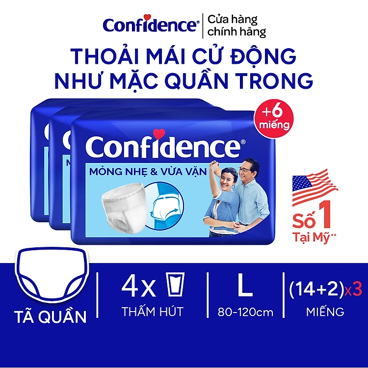 Thùng 3 gói Tã quần người lớn Confidence Slim&Fit mỏng nhẹ vừa vặn size M/L gói 16/14 +2 miếng