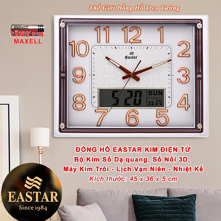 Đồng hồ Treo Tường EASTAR Kim Điện Tử KIM TRÔI Cao Câp DẠ QUANG - LỊCH Vạn Niên và NHIỆT KẾ Điện Tử