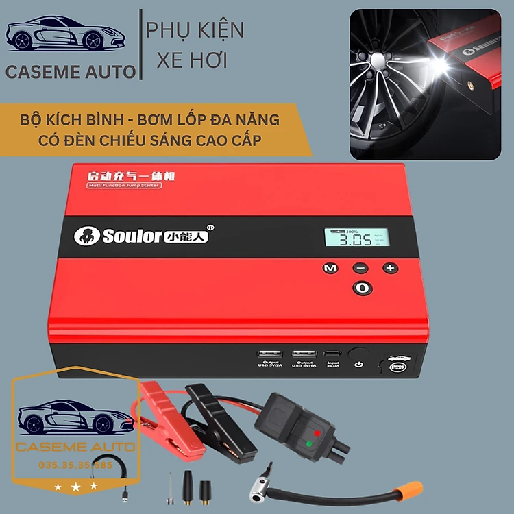 Kích Bình Ô Tô, Bộ Kích Ắc Quy Ô Tô Đa Năng 4IN1 Soulor Kích Điện Ô Tô, Bơm Lốp Ô Tô, Sạc Dự Phòng, Đèn Pin - Hàng Nhập Khẩu