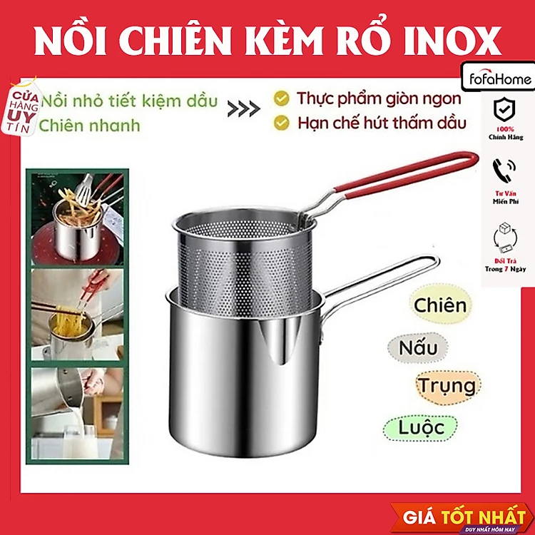 Nồi Chiên Nhúng Ngập Dầu Inox 304, Bộ Nồi Kèm Rổ Lọc Dầu 2 IN 1 Không Gỉ