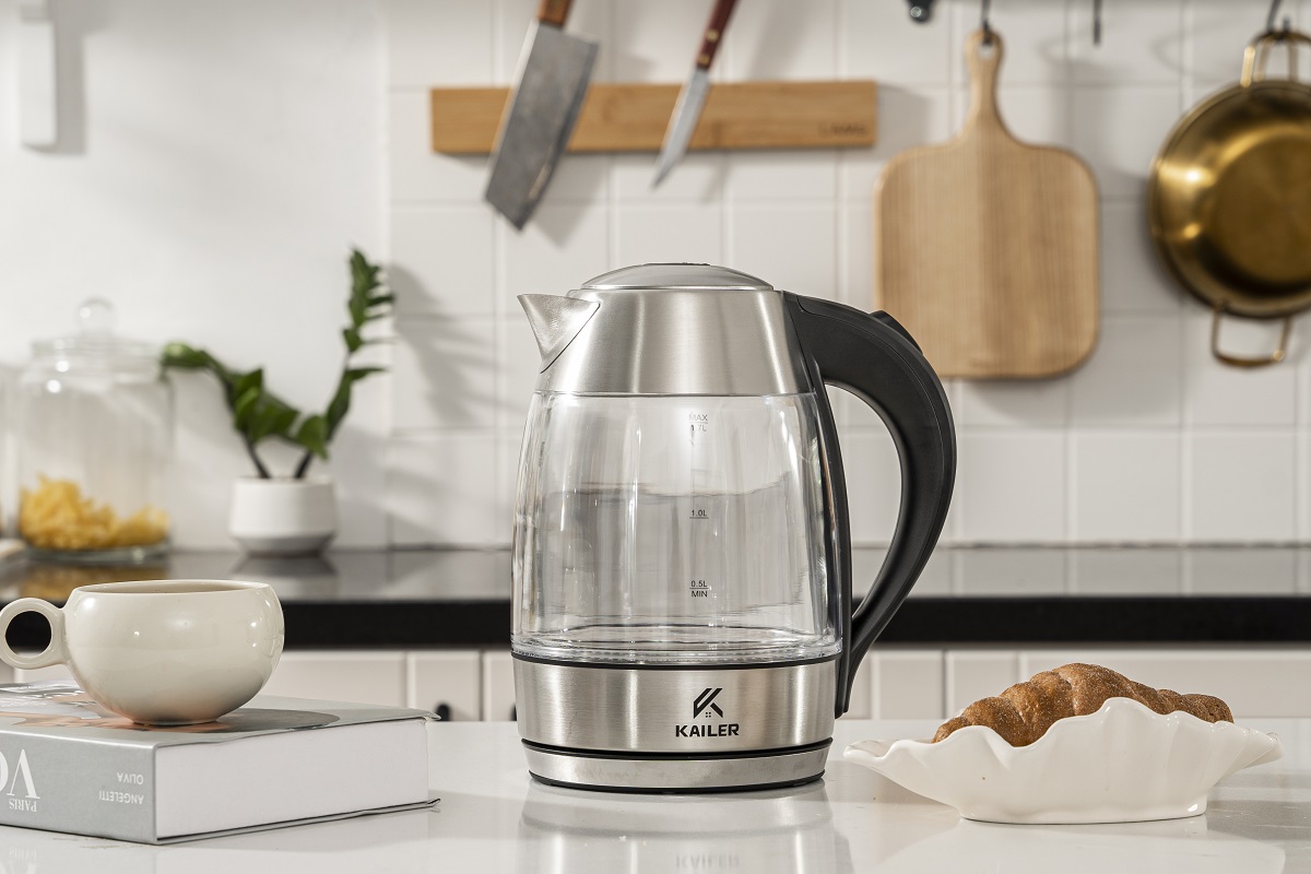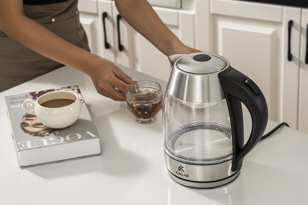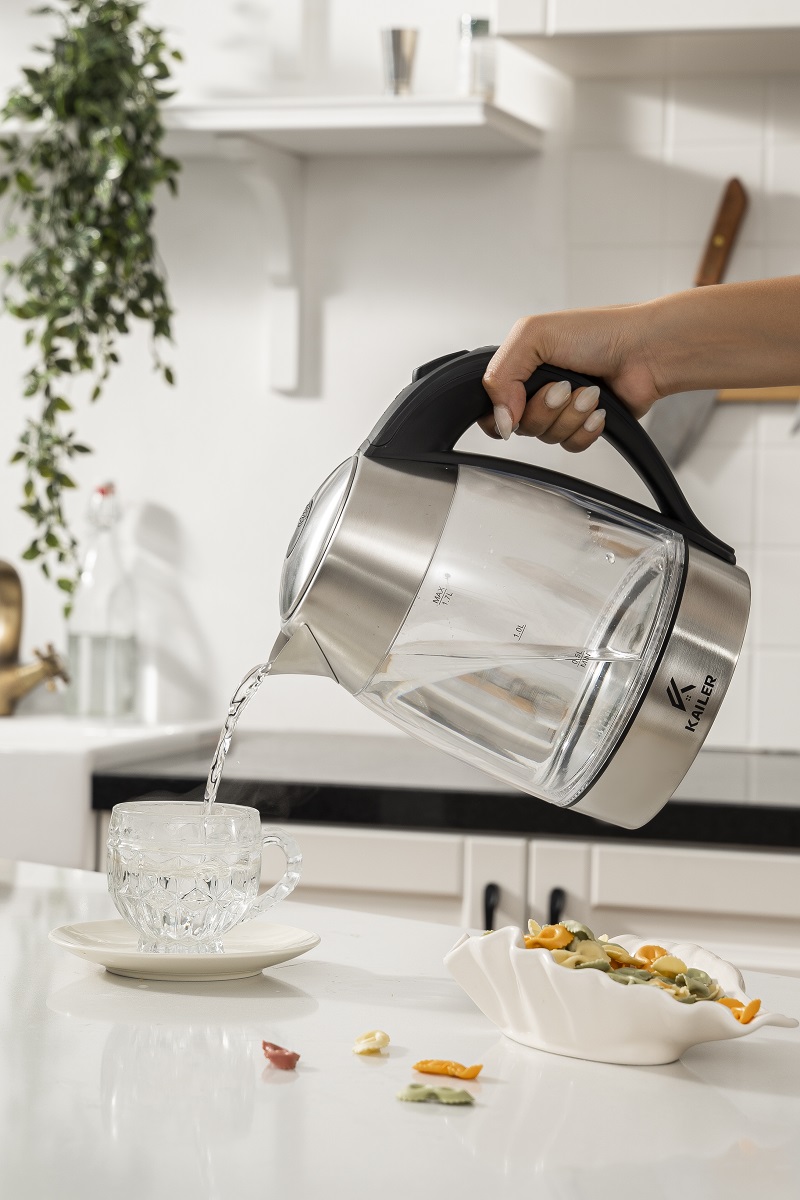 Nâng cấp nhà bếp của bạn với Ấm đun nước thủy tinh Kailer 1,7 lít có đế xoay 360°. Thân bình thủy tinh thiết kế hai lớp bóng bẩy không chỉ tăng thêm sự thanh lịch mà còn cho phép bạn quan sát nước sôi. Rót nước dễ dàng từ mọi góc độ, nhờ đế xoay 360° của ấm. Đun sôi tới 1,7 lít nước một cách dễ dàng—hoàn hảo để pha đồ uống nóng yêu thích hoặc bữa ăn nhanh của bạn.