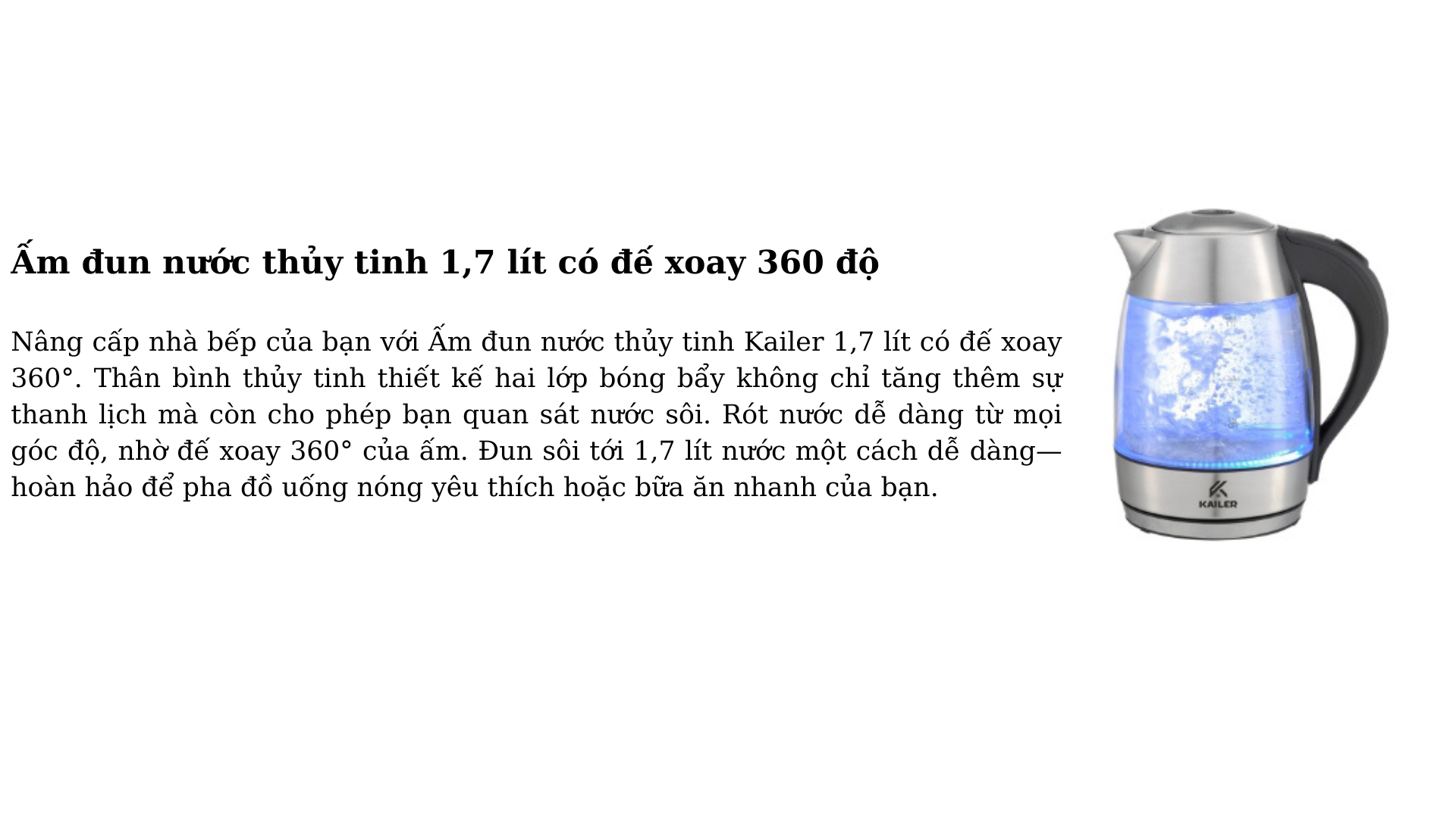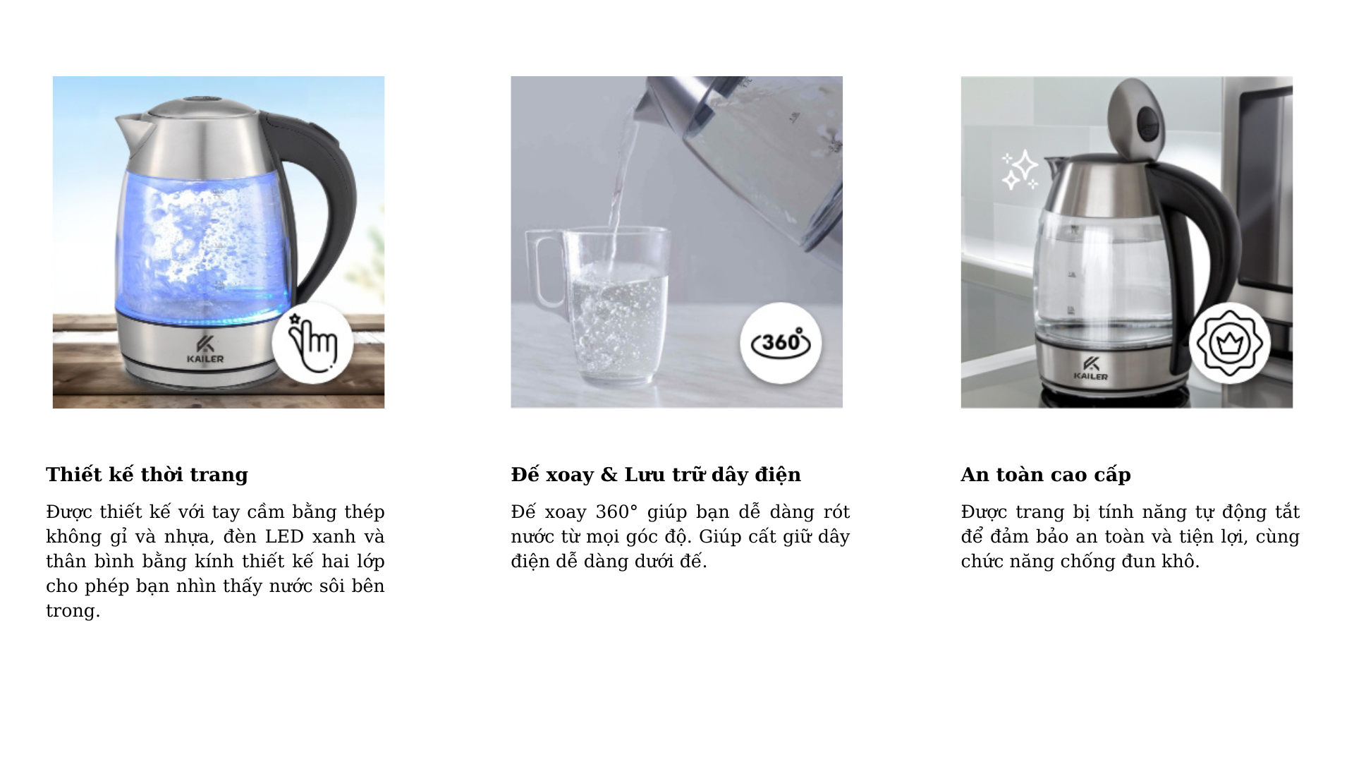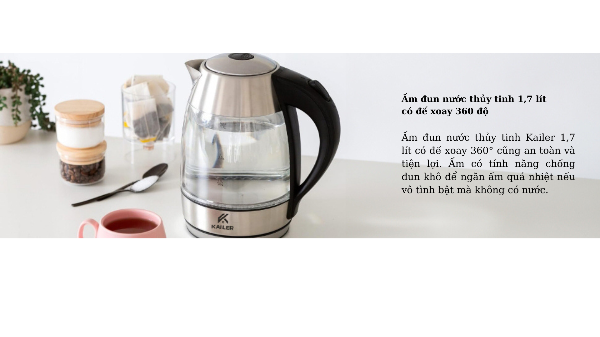 Ấm đun nước thủy tinh Kailer 1,7 lít có đế xoay 360° cũng an toàn và tiện lợi. Ấm có tính năng chống đun khô để ngăn ấm quá nhiệt nếu vô tình bật mà không có nước.