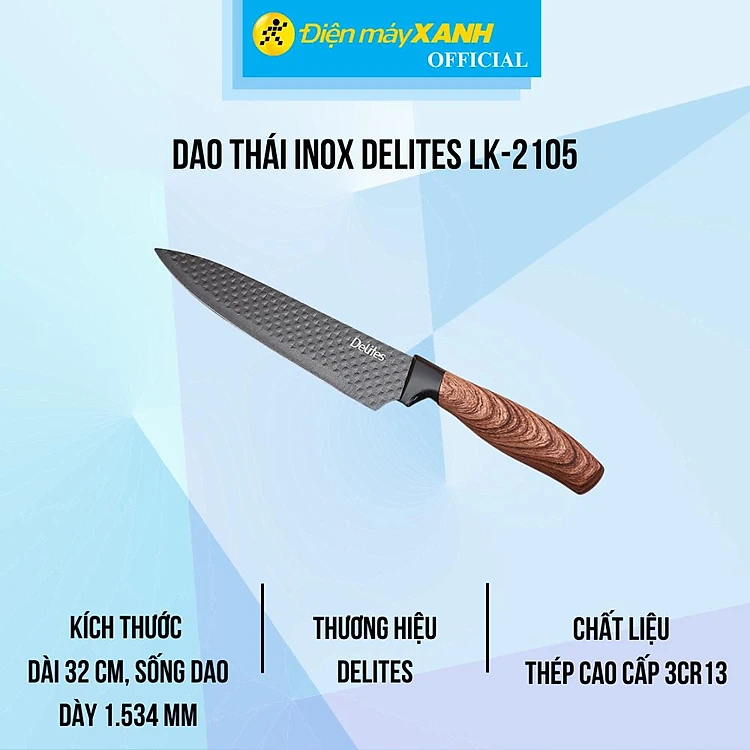 Dao thái inox Delites LK-2105 dài 32 cm có thiết kế và màu sắc trang nhã, đẹp mắt, giúp nâng tầm vẻ sang trọng cho không gian bếp nhà bạn.