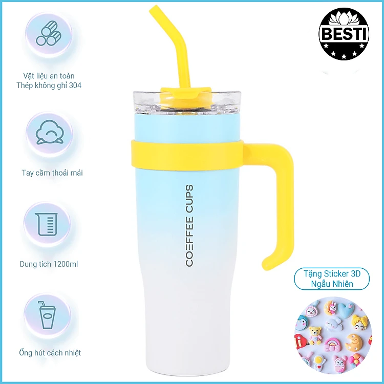 Ly Giữ Nhiệt Inox 304 Cao Cấp Besti - Tặng Kèm Ống Hút Không Gỉ, Ticker 3D, Bình Giữ Nhiệt Có Tay Cầm (1200ml) - Hàng Chính Hãng