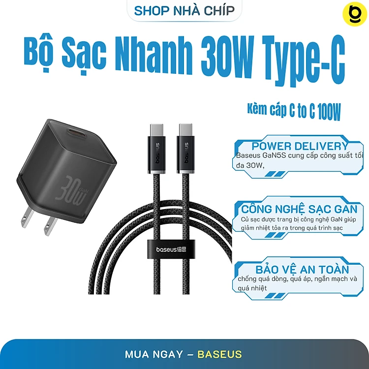 Bộ sạc nhanh Baseus GaN5S Fast Charger 1C 30W Cho iPhone 15 14 13 Pro Max (Nhỏ gọn, sạc nhanh PD/Quick Charge)- Hàng nhập khẩu