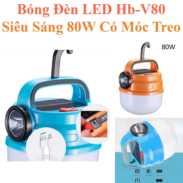Bóng Đèn Tích Điện Hb-V80 80W Siêu Sáng Có Móc Treo Tiện Lợi Tích Hợp Đèn Pin Có Sạc Năng Lượng Mặt Trời