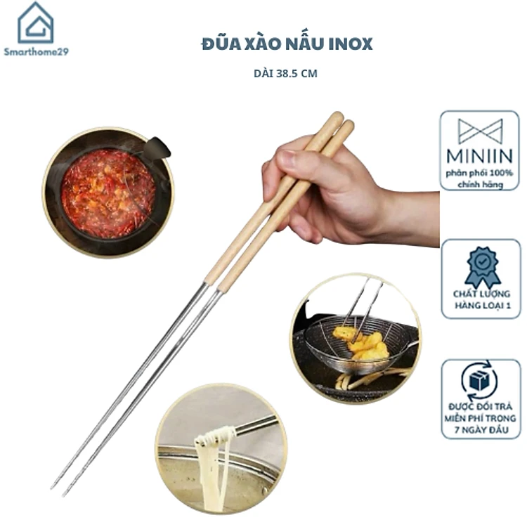 Đũa Inox Dài Nấu Ăn Cán Cầm Gỗ Thông Lõi Inox 304 Chống Han Gỉ Dài 38.5cm- Đũa Xào Nấu Inox - Hàng Chính Hãng MINIIN