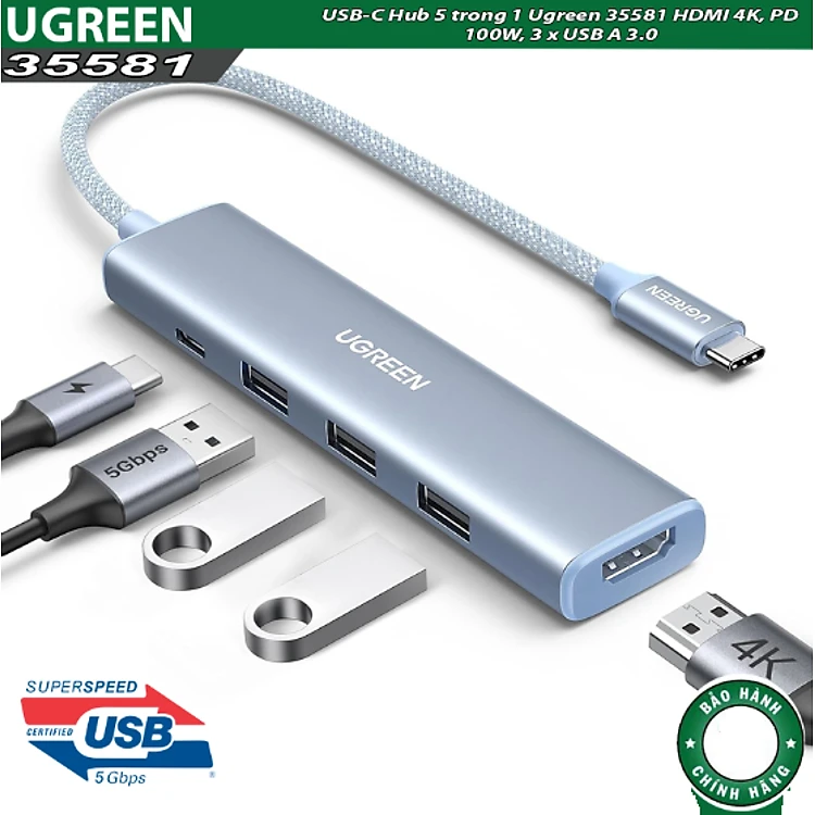 Cáp chuyển USB-C sang HDMI + PD 100W + 3 x USB 3.0 Ugreen 35581 - Hàng chính hãng