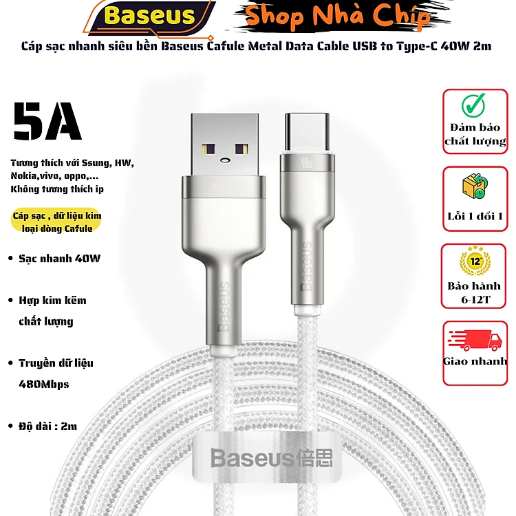 Cáp sạc nhanh siêu bền Baseus Cafule Metal Data Cable USB to Type-C 40W 2m (Hàng nhập khẩu)
