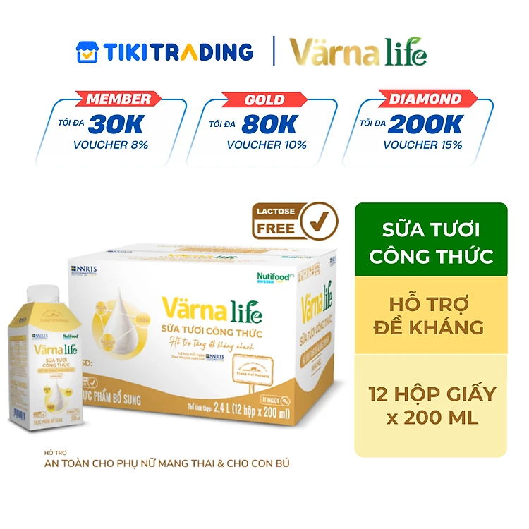 Thùng Thực phẩm bổ sung Värna Life sữa tươi công thức (Vàng) (12 hộp x 200ml)
