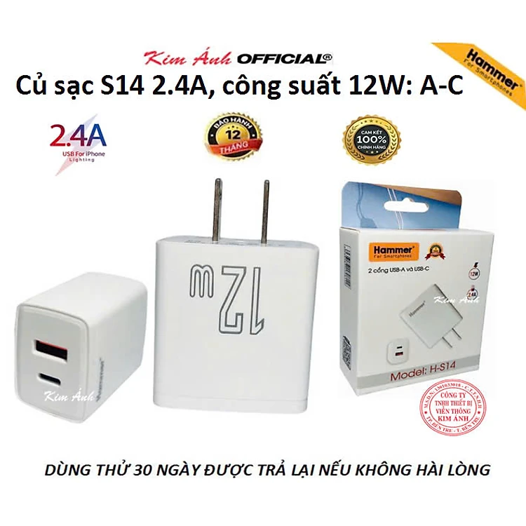 Củ sạc Ham mer H-S14, dòng điện 2.4A công suất 12W có 2 cổng (Type C và cổng USB), Check Qr hàng chính hãng