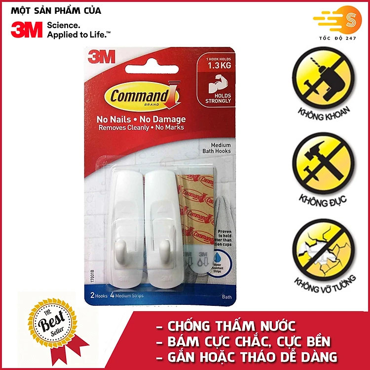 Bộ 2 móc treo tường cường lực siêu dính chống thấm nước 1300 gram Command 3M 3M-17001B