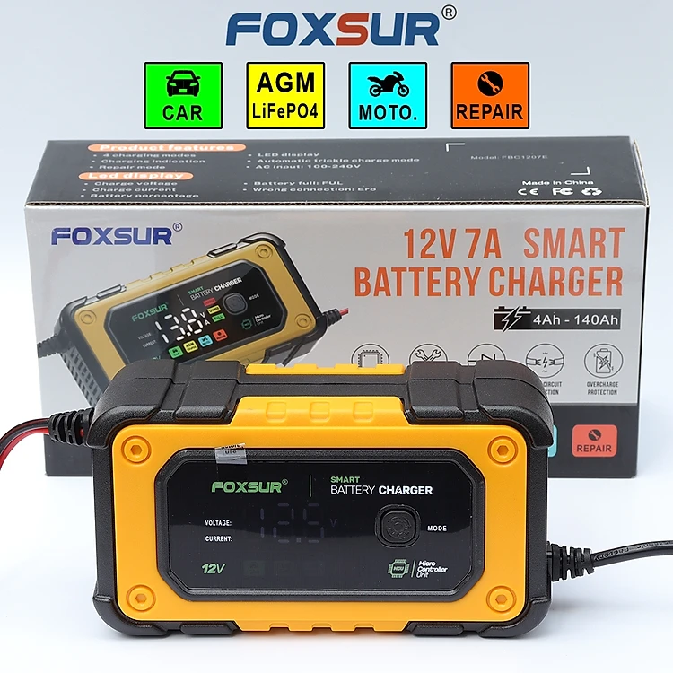 ạc bình ắc quy Foxsur 7A 12V(4Ah - 140Ah)sạc cho cả pin LiFePO4 tự ngắt khử sunfat chống ngược cực chống chập