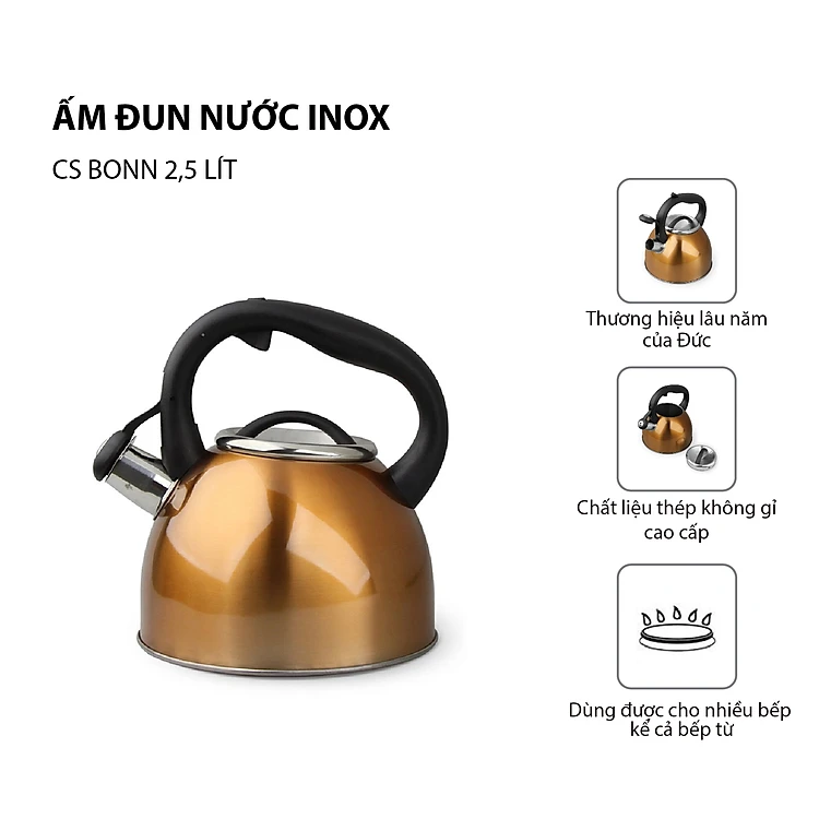 Ấm đun nước Inox CS BONN 2,5L bằng thép không gỉ, có đáy bình được làm bằng nhôm nguyên khối giúp tỏa nhiệt nhanh, tiết kiệm thời gian đun sôi. Từ đó giúp tiết kiệm năng lượng hơn.