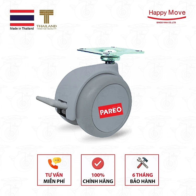Bộ 4 bánh xe càng xoay có khóa 38-50mm cho ghế/bàn xoay văn phòng nội thất - tải 40kg - Happy Move Thái Lan