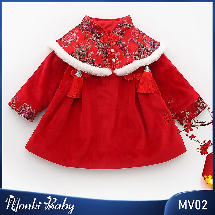 Váy nhung bé gái cao cấp, chất nhung mềm mại lót lông dày ấm, tay áo trần trám, kèm choàng vai xinh, sắc đỏ rực rỡ. MV02