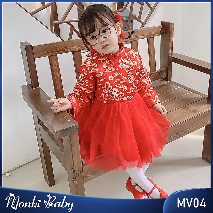 Váy gấm đỏ lót lông bé gái, chất dày dặn đẹp, họa tiết thêu nổi sang chảnh, lông lót mềm ấm, dáng bồng công chúa, có thể mặc sinh nhật, sự kiện, lễ Tết hay mẫu ảnh | MV04