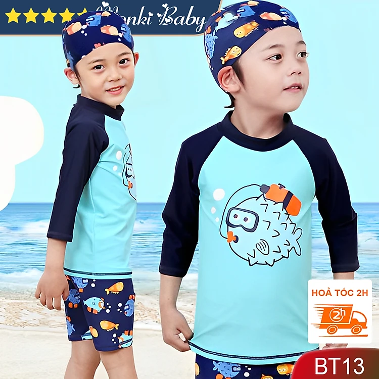 Set đồ bơi bé trai tay lỡ kèm mũ bơi, vải thun bơi Hàn co giãn 4 chiều, dày dặn mịn mát, bộ bơi 2 mảnh con trai dày dặn đẹp | BT13