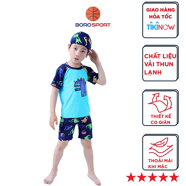 Bộ Đồ Bơi Khủng Long Xanh Dành Cho Bé Trai CaoTừ 85cm - 125cm chất vải Polyeste thân thiện với trẻ em, mau khô, thấm hút mồ hôi tốt, thiết kế thời trang bắt mắt - Tặng kèm nón bơi vải cùng màu
