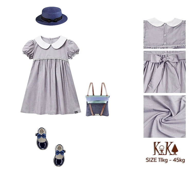 Đầm Bé Gái Kika Vải Caro Xám Cổ Sen Trắng Ren Ngực K108