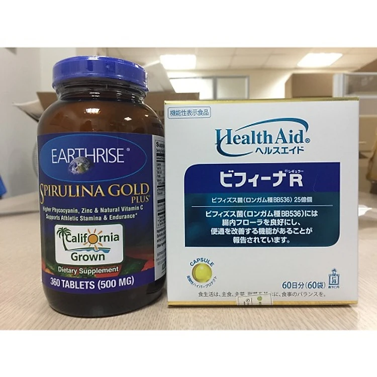 Combo: Tảo Mặt Trời Earthrise Spirulina Gold Plus và Men vi sinh Bifina R Nhật bản 60 gói