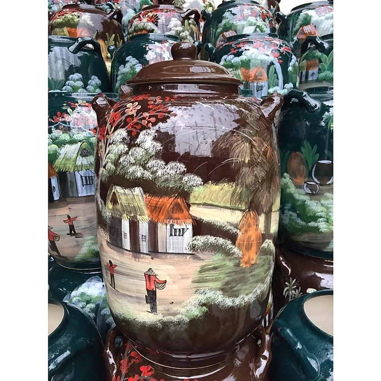 Hũ đựng rượu gạo Bát Tràng men nâu vẽ cảnh loại 15L