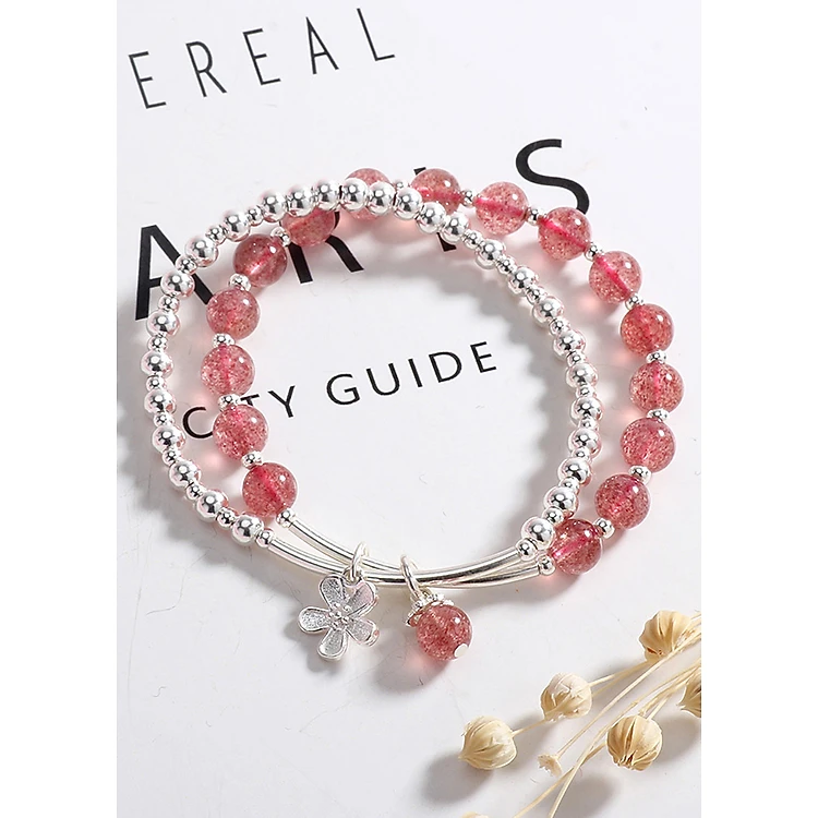 Vòng tay 2 line đá thạch anh dâu phối charm hoa bạc mệnh hỏa, thổ - Ngọc Quý Gemstones