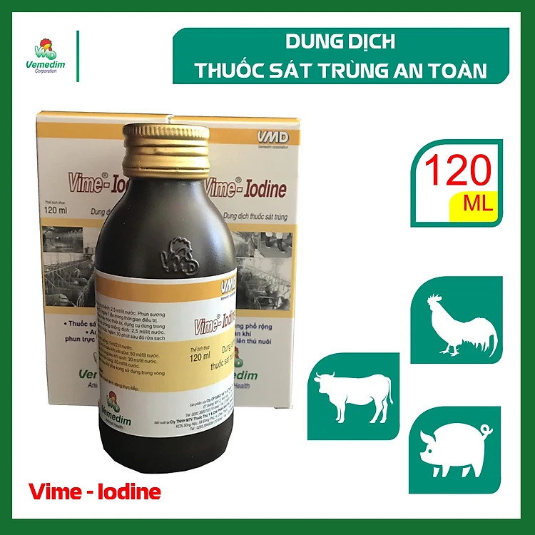 Tẩy trùng vết thương cho heo, trâu bò, gia cầm, chó mèo Vime-Iodine (Chai 120ml)