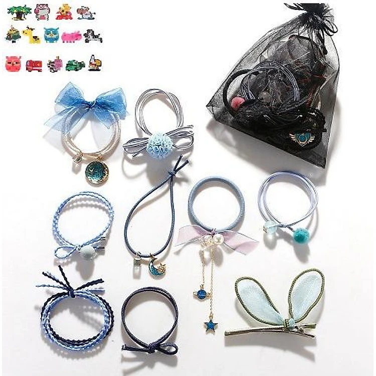 Thiết kế túi vải xinh xắn gồm 9 cột tóc với nhiều mẫu khác nhau, dây buộc tóc nhẹ nhàng kết hợp những chi tiết trang trí dễ thương, đáng yêu cho các bạn gái tha hồ diện mỗi ngày, chất thun co dãn tốt, bền, đẹp.