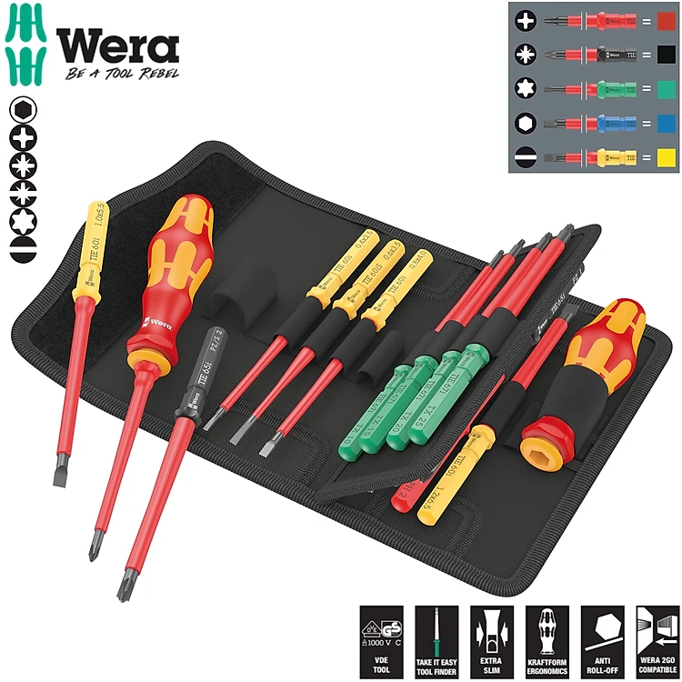 Bộ tua vít cách điện Kraftform Kompakt VDE 17 Universal 1 gồm 4 cạnh, dẹp, hoa thị các đầu vít thay đổi được gồm 17 chiếc Wera 05006611001