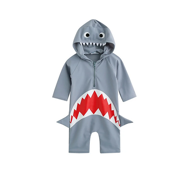 1. Đây là bộ trang phục có nón trùm, và em bé sẽ trông dễ thương như một con cá mập. Có khóa kéo trên ngực, thích hợp mặc đi bơi, suối nước nóng,