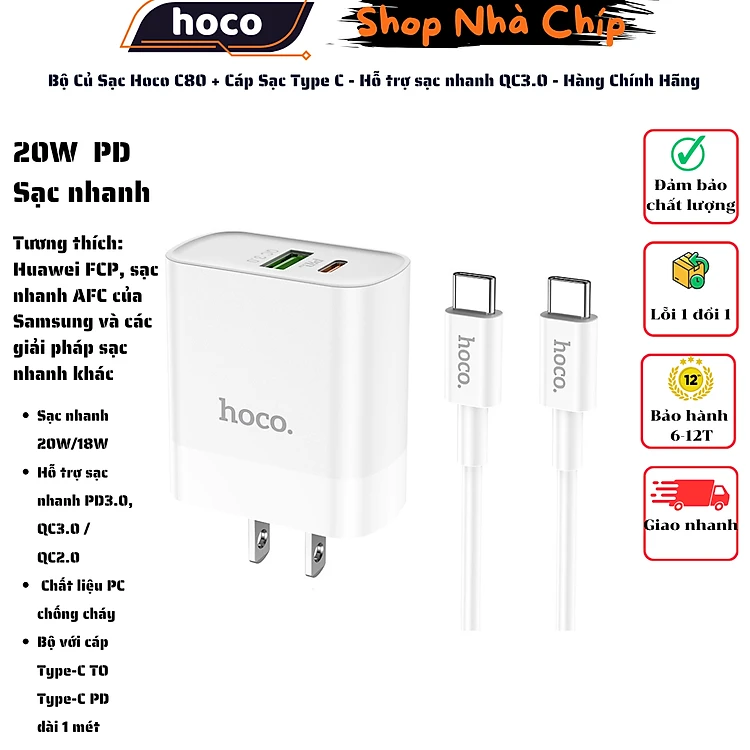 Bộ Củ Sạc Hoco C80 + Cáp Sạc Type C - Hỗ trợ sạc nhanh QC3.0 - Hàng Chính Hãng