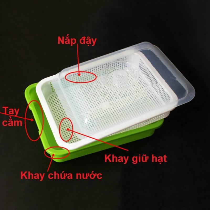 Khay có cấu tạo 3 lớp, lớp dưới chứa nước, lớp trên có cấu trúc dạng lưới để rau có thể cắm rễ xuống hút dinh dưỡng, nắp đậy giúp giữ ấm vào mùa đông làm mát vào mùa hè, cách ly tốt với môi trường. Chúng tôi có các sản phẩm : Khay trồng rau mầm thủy canh 2 lớp, Khay trồng rau mầm thủy canh 3 lớp có nắp đậy.