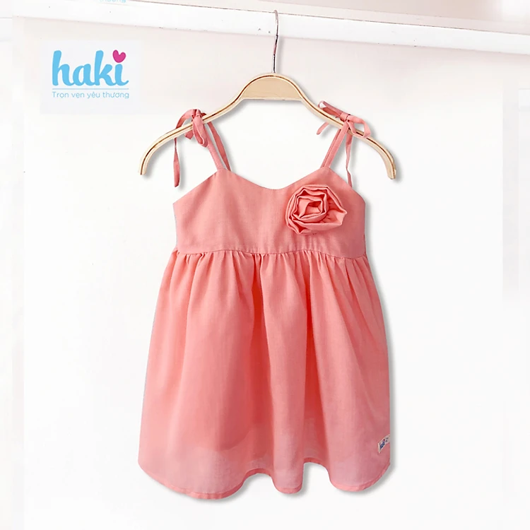 Váy bé gái hai dây đính hoa hồng Haki duyên dáng, đáng yêu!