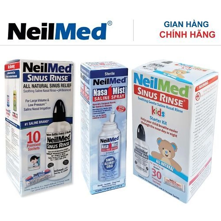 Combo Small FamilyCare: Bình Xịt Rửa Mũi Xoang Cho Gia Đình NeilMed SinusRinse & Moisturize - SX Mỹ (Bình 10 gói lớn; Bình 30 gói bé; 1 chai xịt phun sương)