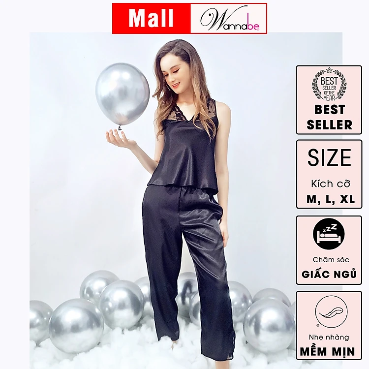 Đồ bộ mặc nhà phi lụa Wannabe, bộ dài bds04 viền ren hoa nữ tính, sang trọng