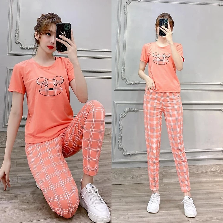 Đồ Bộ Cotton Phối Sọc- Áo thêu Logo Đáng Yêu- Sản Phẩm Y Hình