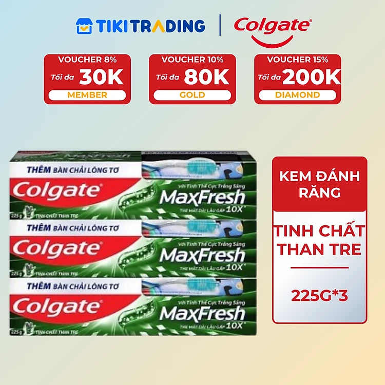 Bộ 3 Kem đánh răng Maxfresh Bamboo Charcoal 225g kèm bàn chải lông tơ phủ than