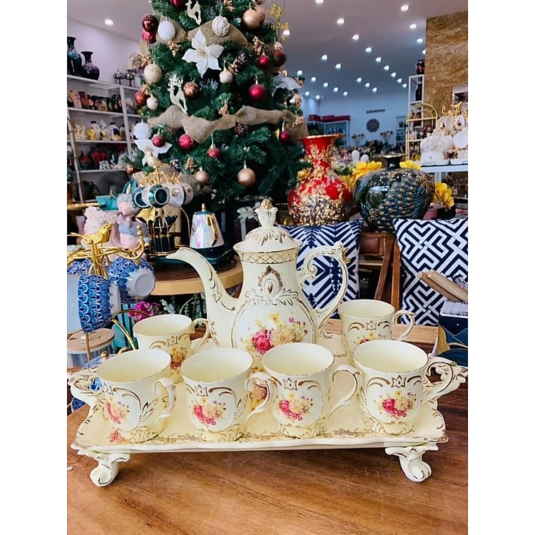 Bộ bình trà sứ phong cách hoàng gia cổ điển màu trắng ngà họa tiết hoa cúc - ANTH603