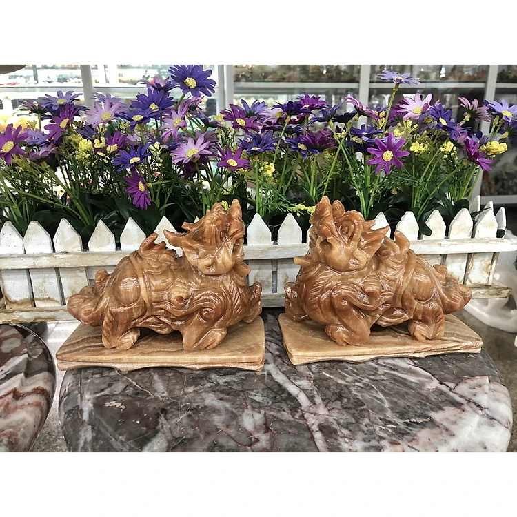 Cặp Tỳ Hưu phong thủy đá cẩm thạch vân gỗ có đế - Dài 15 cm