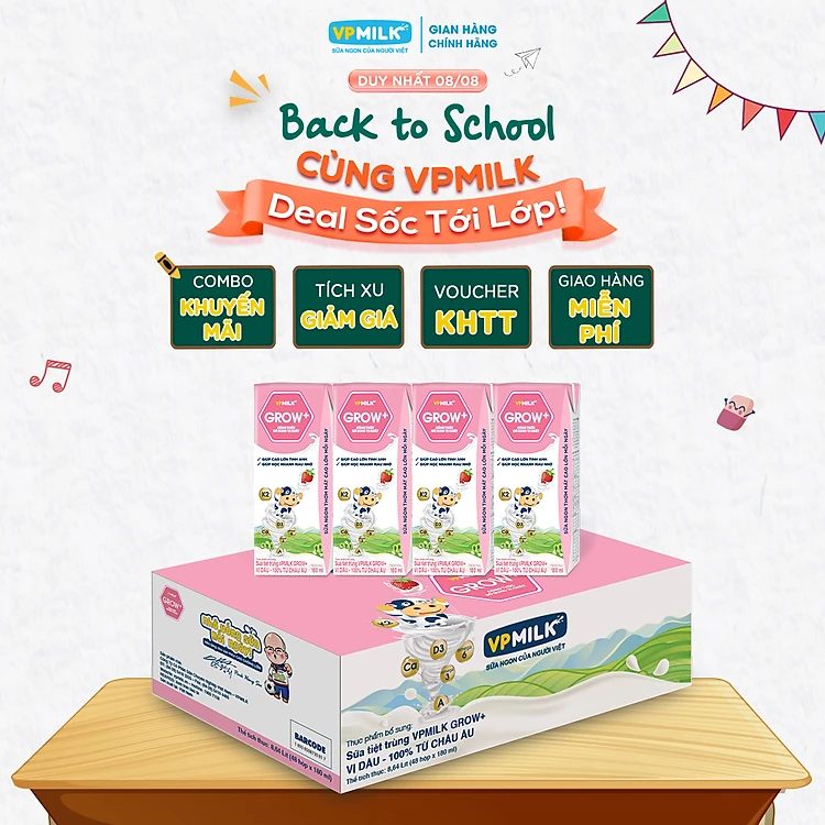 Sữa Tiệt Trùng Có Đường VPMilk Grow+ Vị Dâu Hộp 180ml (Thùng 48 Hộp)