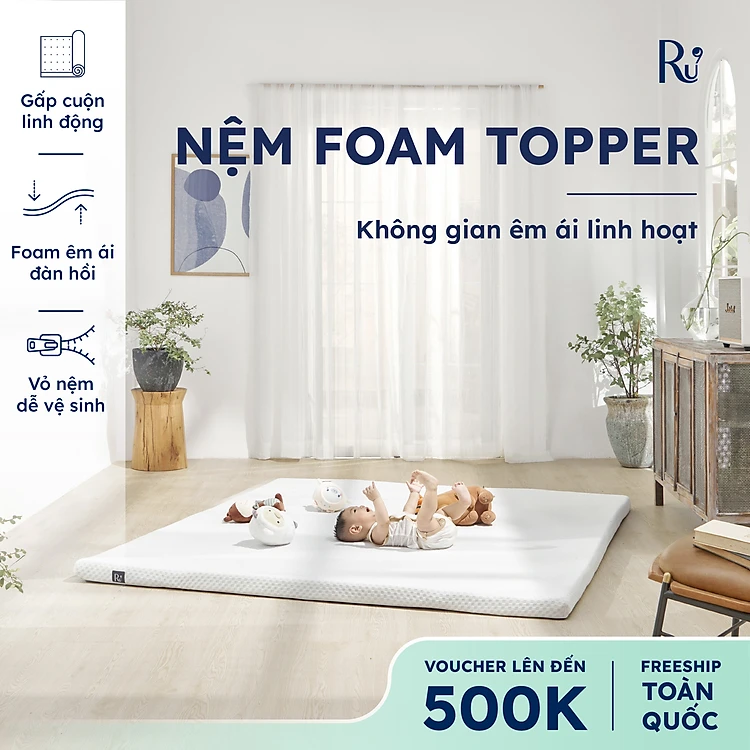 Nệm Foam Topper Ru9 Cao Cấp | 2 Lớp Foam Giúp Nâng Đỡ và Êm Ái | Dễ Dàng Di Chuyển | 7 Kích Thước