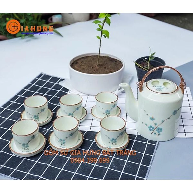 Bộ ấm tích men kem vẽ hoa đào gốm Gia Hưng Bát Tràng
