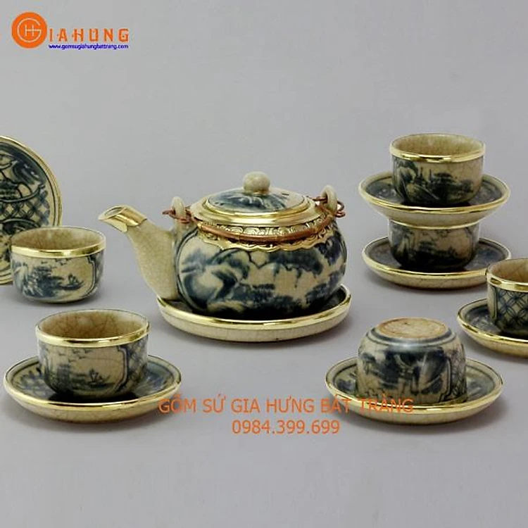 Bộ ấm chén Nhật men rạn bọc đồng gốm sứ Bát Tràng (bộ bình uống trà, bình trà)