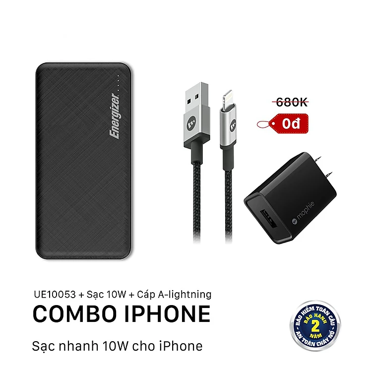 Combo Pin Energizer 10,000mAh UE10053 + Sạc nhanh Mophie 10W kèm Cáp A to Lightning 1M - HÀNG CHÍNH HÃNG