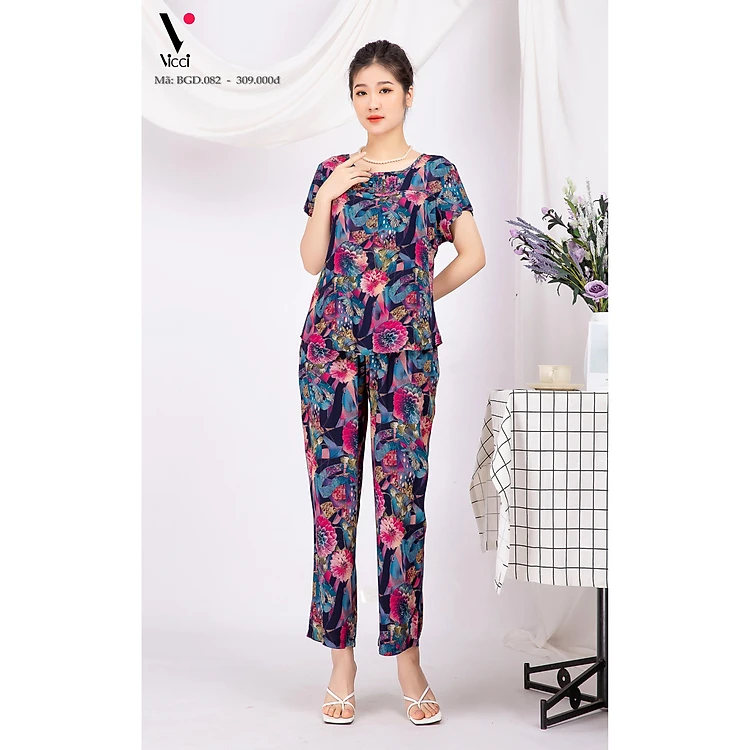 Bộ đồ nữ mặc nhà trung niên cho các bà, các mẹ - Bộ đồ ngủ Tole (lanh) - Bộ mặc nhà trung niên vải lanh (tole) Vicci BGD.082, thiết kế áo cộc tay phối quần dài in hoạ tiết (Màu 1-2-4)