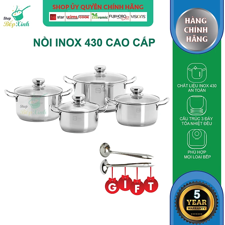 Bộ 4 nồi inox Fivestar 3 đáy bếp từ , inox 430 , nắp kính ( tặng 1 vá canh )