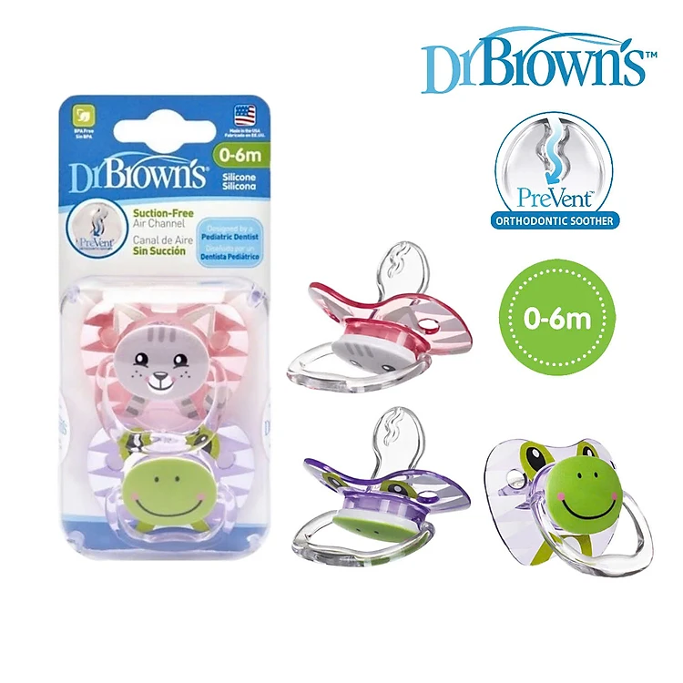 [ PV12014 ] Bộ 2 ty ngậm hỗ trợ chống đột tử/chỉnh nha/chống vẩu Dr.Brown's Prevent họa tiết con mèo và con ếch ( 0-6m )