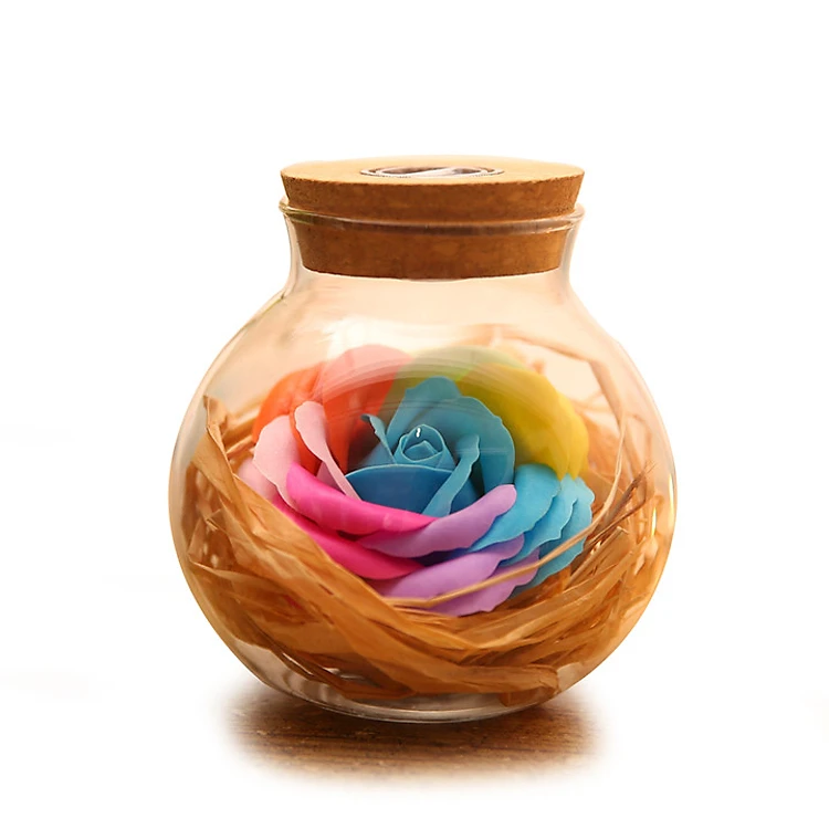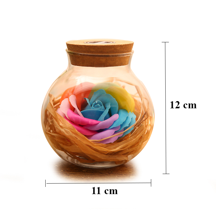 - Lọ hoa hồng sáp thủy tinh phát sáng được làm từ chất liệu sáp có khả năng lưu lại hương thơm từ 2 – 3 năm. Màu sắc tươi sáng, tự nhiên như hoa tươi.