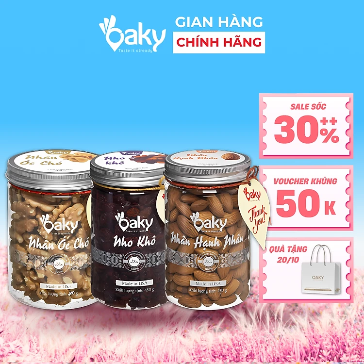 Quà Tặng Oaky - Combo Hạt Dinh Dưỡng Cao Cấp Hạnh Nhân, Nhân Óc Chó Vàng, Nho Khô - Tặng Túi Giấy Sang Trọng